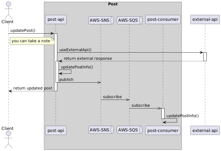 - 포스트 수정 시 외부 api를 연동하여 업데이트를 진행하고, post를 관심사로 갖는 도메인이 변경사항을 구독하여 포스트 정보를 업데이트하는 시퀀스를 가정해봤다.